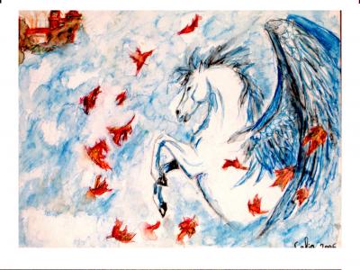 Al grano. Este dibujo es mi "pegaso" pintado con acuarelables...¿ Qué defecto le sacaríais? Yo creo que el problema es la poca variedad de colores...Creo que me estoy enrollando mucho.